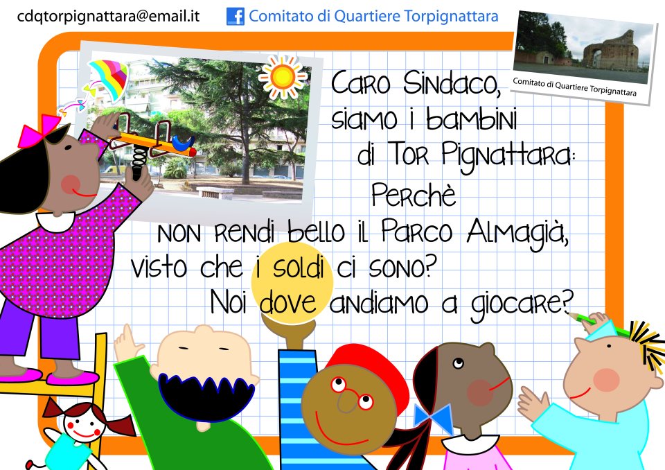 Il Parco Almagià è un piccolo e prezioso fazzoletto verde in mezzo ai palazzi di Tor Pignattara: da anni è abbandonato, senza manutenzione e ridotto al degrado. Da 18 mesi sono stati stanziati € 95,000 per la sua ristrutturazione ma i fondi non vengono sbloccati dal Comune di Roma. Abbiamo fatto tanti reclami, ma non ci ascoltano: FORSE DOBBIAMO ESSERE DI PIU’ A GRIDARE! Sabato 10 marzo alle ore 11,00 ci ritroveremo al Parco per mettere le locandine e degli striscioni di protesta fatti all’istante. SIAMO INVITATI CON I NOSTRI FIGLI, GENITORI, AMICI PER RECLAMARE IL DIRITTO AL VERDE! Se tra noi c’è qualche giornalista e fotografo, dovrebbe rendersi disponibile affinchè questo evento venga immortalato e reso pubblico, sia su stampa che in video. FACCIAMO SENTIRE LA NOSTRA VOCE E QUELLA DEI NOSTRI BAMBINI!