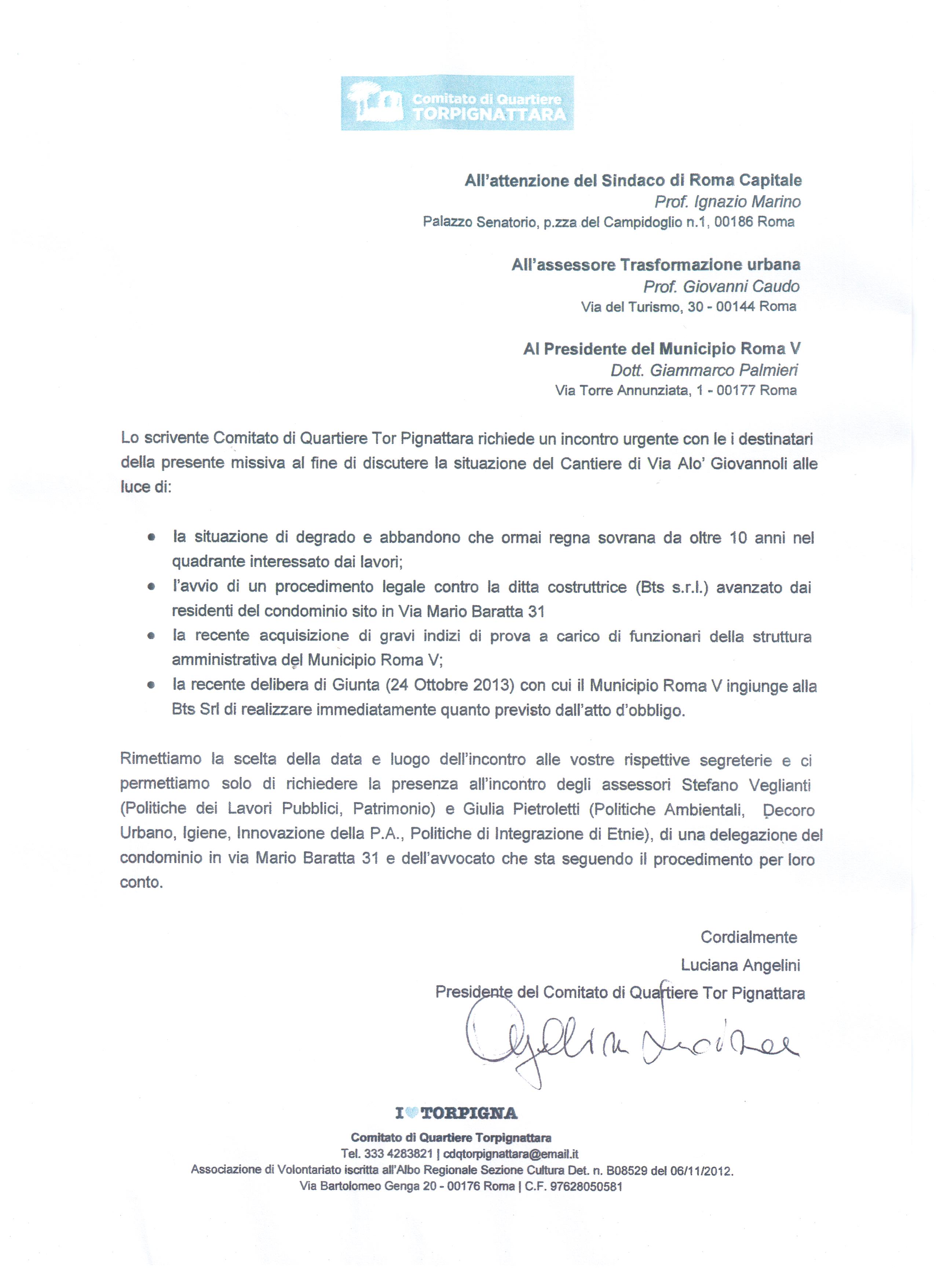 Il comitato di quartiere ha richiesto un incontro congiunto con il Sindaco di Roma Ignazio Marino, l’assessore alla Trasformazione Urbana Giovanni Caudo e il Presidente del Municipio V Giammarco Palmieri per discutere l’annoso problema del cantiere di Via Giovannoli.