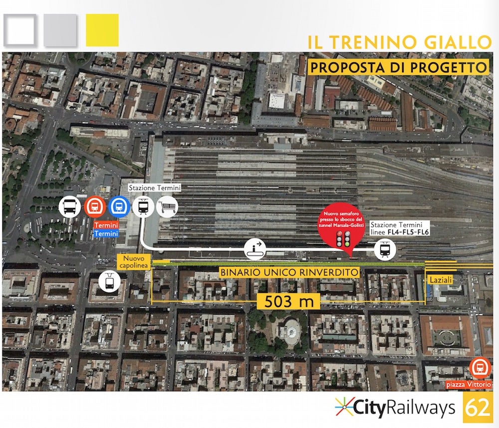 Nel nostro piano di ammodernamento della linea Roma-Giardinetti prevediamo un intervento stimabile in non più di 4 milioni di euro che consentirebbe di attestare il capolinea della linea al suo vecchio capolinea del 1939, ovvero di fianco all’ala Mazzoniana (a ridosso di Via Gioberti) e quindi vicinissimo all’uscita Giolitti della Stazione Termini. Abbiamo mutuato la proposta dal sito City Railways che nel suo dossier il Trenino Giallo avanza un’ipotesi tecnica che effettivamente è una semplicità disarmante.