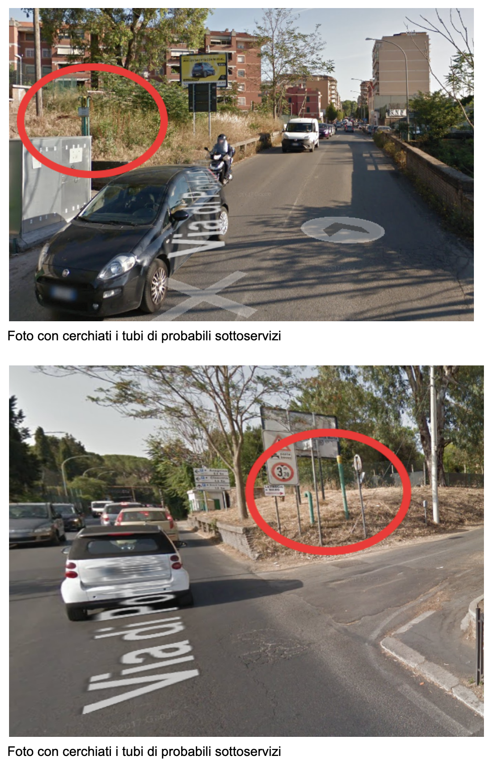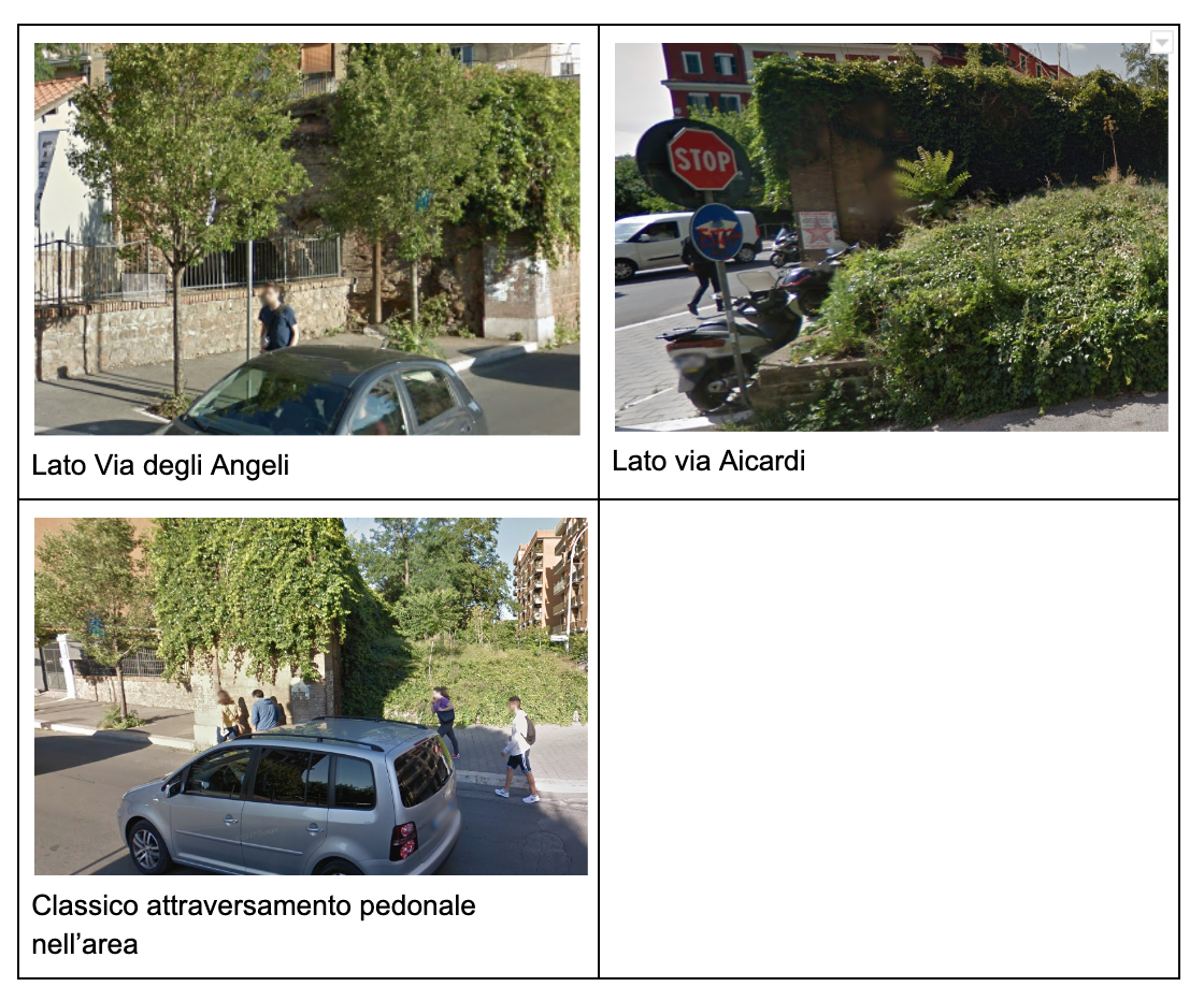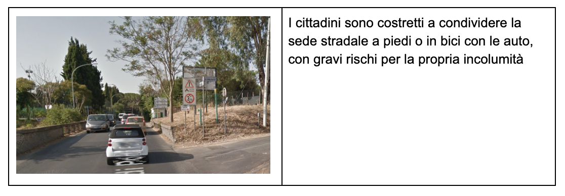 Nello specifico in sede di laboratorio è emersa la possibilità di allargare la sede sulla destra (direzione Arco di travertino) erodendo una piccola porzione di un’aiuola verde in elevato. Un allargamento della carreggiata esistente di circa 60mq, che copra l’intera lunghezza del ponte (circa 27m) erodendo circa 2mt lineari di aiuola. Questo allargamento creerebbe le condizioni per creare almeno un marciapiede di 1,5mt lineare di larghezza per consentire il transito pedonale. L’intervento che va verificato in quanto la presenza di alcuni tubi di dispersione fa pensare alla presenza di sottoservizi non meglio precisati.