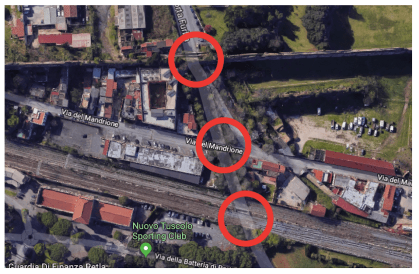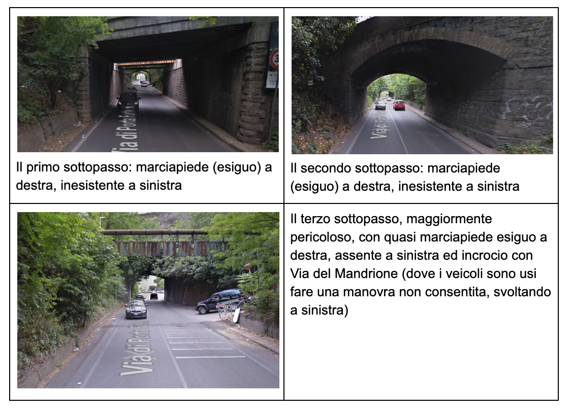 Altro punto di particolare pericolo è rappresentato dall’attraversamento dei sottopassi di Via di Porta Furba. Come si evince dalle foto esiste un solo marciapiede (non protetto) sul lato destro (rivolti verso Arco di Travertino) e non esiste nell’altro lato. Spesso – a causa della fitta vegetazione presente – la marcia viene impedita da rami caduti oppure dal fogliame in eccesso.